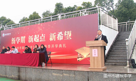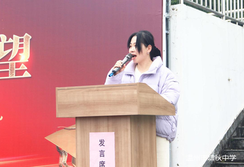 来自高一(5)班的张子静作为学生代表讲话。作为啸秋学子,我们在学习和成长中,要向阳而行,以“长风破浪会有时”的精神迎接每一次挑战,将未知变成知识,开创未来的无限可能。立下切实的目标,练就过硬的本领,始终保持初生牛犊不畏虎的劲头,努力把理想变为现实。“会当凌绝顶,一览众山小”,富有雄心壮志的少年学子在新的学期整装待发,敢试锋芒,以全新的面貌迎接学考和高考的到来。